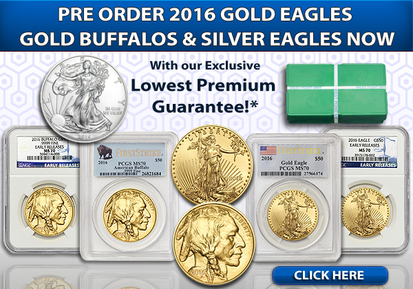 2016 1oz Gold Eagles PCGS/NGC First Strike/Early Release MS70, 1oz Gold Buffalo PCGS/NGC First Strike/Early Release MS70 & MS69, and 1oz BU Silver Eagles and Green Monster boxes, are now available for pre-order at today's low Gold and Silver prices. This LOWEST PREMIUM GUARANTEE offer is available for a limited time by clicking the links above, calling 888-454-0444, or emailing [email protected]