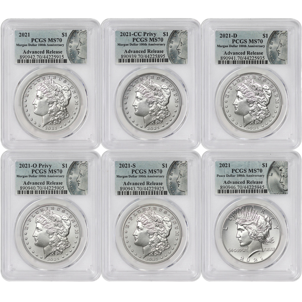 Set of 6 2021 $1 Silver Morgan & Peace Dollar PCGS MS70 AR