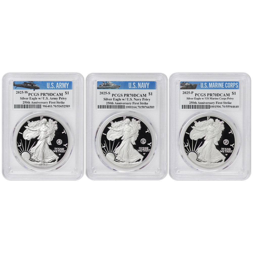 Set of 3 2025 $1 Silver Eagles Army, Navy, & Marine Corps 250th Anniv PCGS PR70DCAM FS Military Label w/OGP