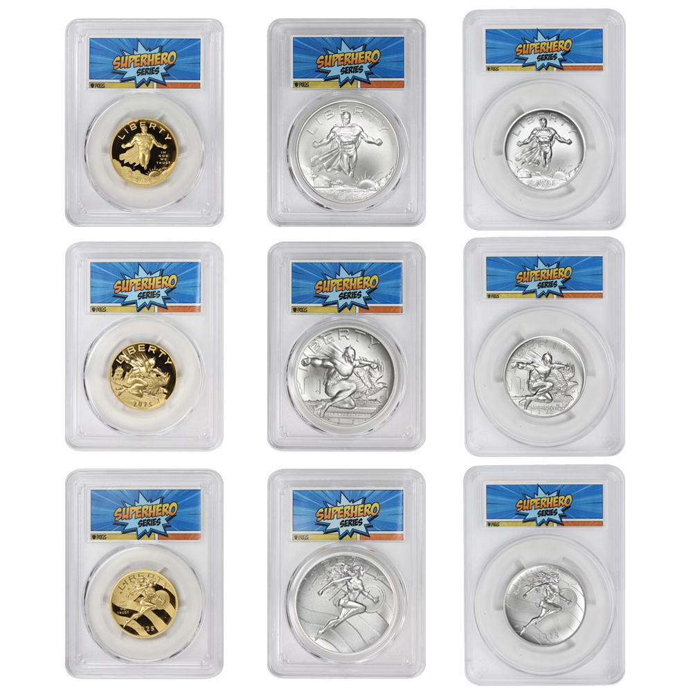 Set of 9 2025 Gold Superman, Batman, Wonder Woman & Silver Medals 2025 PCGS PR70DCAM & MS70 FDOI Superhero Label w/ OGP