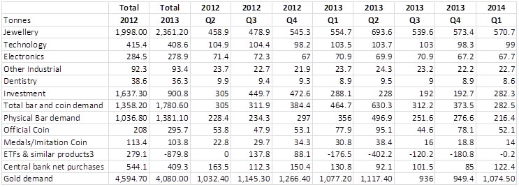 The supply/demand fundamentals for precious metals have never looked better. These fundamentals (look at the World Gold Councils 2012 to 2014 quarterly demand numbers below) show a 13% increase in demand in the first quarter of 2014. These numbers, combined with the many geopolitical problems around the world, and all of the significant global geopolitical tensions, especially in Iraq and the Ukraine, continue to make front page headlines. These problems and similar on-going worldwide situations are causing many investors to look at Gold as the ultimate safe haven investment.