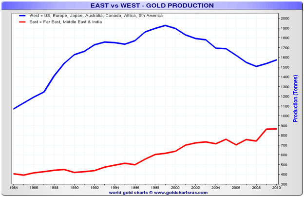 We see the same dynamic in production. It is growing in the East and, since 1999, has been falling in the West, as the next chart shows. China is now the world’s largest producer. Russia looks set to replace Australia as the world’s second largest.