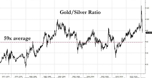 As the bank explains, similar to gold investors have raised their exposure to the white metal over concerns about the current economic policy. Yet, with silver more exposed to industrial demand, these purchases did not matter during the lockdowns, with the gold:silver ratio peaking at 124, and still a ways away from its long-term average of 59x.