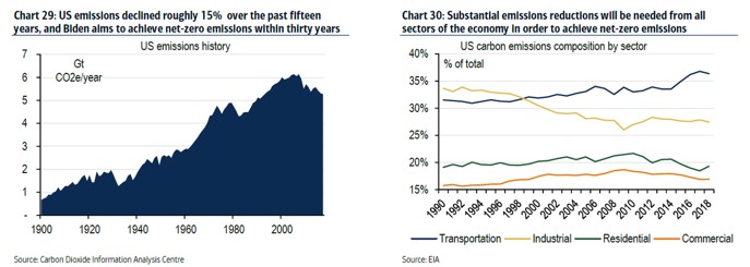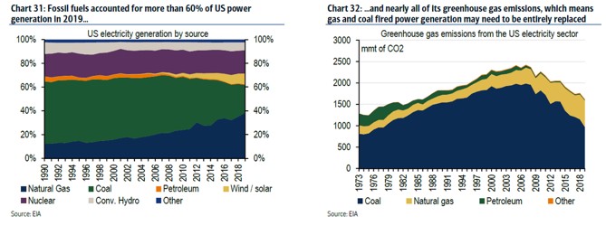 Biden’s climate plan also targets zero emissions from the power sector by 2035, which would require an overhaul of the industry. Coal, natural gas, and petroleum generated more than 60% of the power in the US in 2019 and nearly all CO2 emissions. According to Biden’s climate plan, an emissions-free power sector may be achieved through a combination of changes. First, increased end consumer efficiency, which would help cap or reduce power demand over time. Second, the power sector would need to build grid scale storage to support substantial increases in renewable power generation. Third, fossil fuel power generation would need to be replaced with renewables, nuclear, and other low/no carbon alternatives and negative carbon energy technologies would likely be required to offset any remaining fossil fuel powered generation.