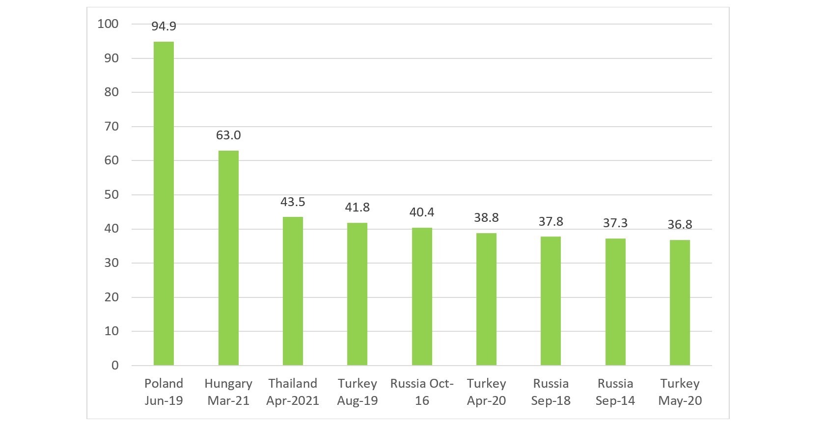 As Krishan Gopaul’s blog post last week pointed out, central banks have been buying gold during the first four months of 2021. Over that period, we estimate that the official sector has added 150-200 tonnes of gold. A significant portion of this buying has come from the central banks of Hungary and Thailand, who added 63 tonnes in March and 43.5 tonnes in April, respectively. In fact, these two purchases are the second and third largest monthly central bank gold purchases in recent history, eclipsed only by Poland’s 100 tonne purchase in June 2019 (see chart below).