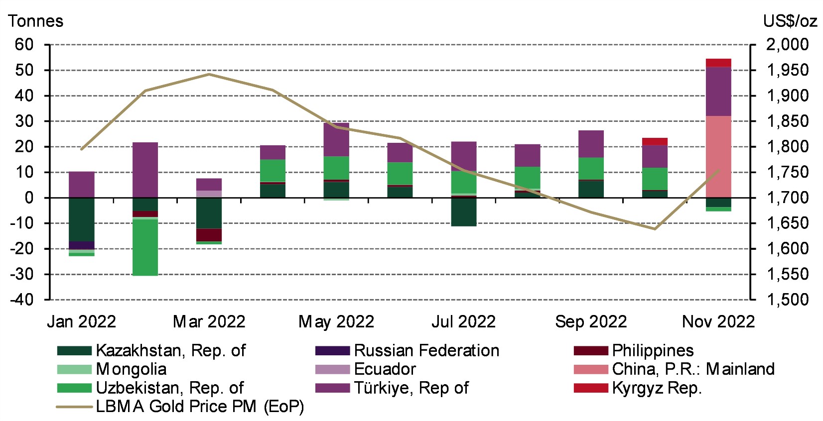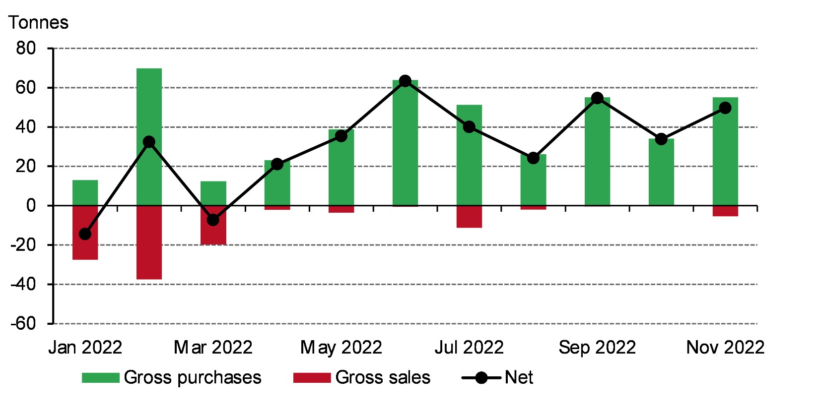 I've spoken before about central banks' sizeable appetite for gold during 2022 in this blog series, and November was no different. Central banks bought a further 50 tonnes (t) on a net basis during the month, a 47% increase from October's (revised) 34t.1 Of this net total, three central banks accounted for gross buying of 55t, while two largely contributed to gross sales of 5t , showing the strength of demand.