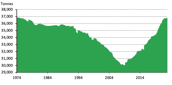 Central banks continue to accumulate gold according to the latest data available.1 In October – data is lagged by two months – central banks added a further net 31t of gold to international reserves (-41% m-o-m). This initial figure helps lifts global official gold reserves to its highest level since November 1974 (36,782t).