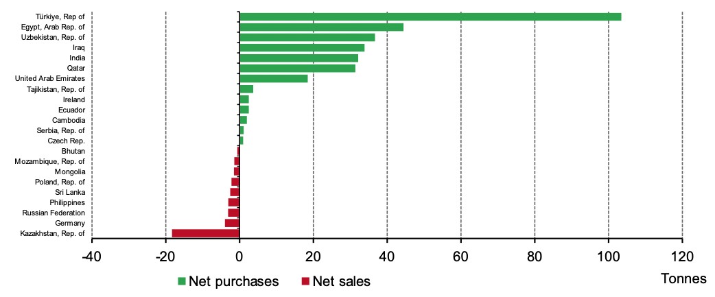 The Central Bank of Türkiye (Turkey), the largest gold buyer y-t-d, bought a further 9t of gold in October.2 Its y-t-d net purchases now total 103t, the highest level of buying since 2019 (126t), with gold reserves standing at 498t (27% of total reserves).