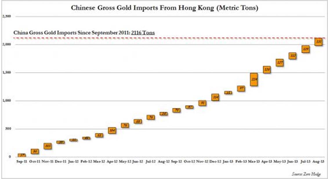 As the chart below shows, in the past two years since September 2011 (ironically the same month we wrote "Wikileaks Discloses The Reason(s) Behind China’s Shadow Gold Buying Spree" namely that the PBOC (People’s Bank of China) was quietly seeking to make the renminbi the new gold-backed reserve currency) China has imported an unprecedented 2,116 gross tons of gold from Hong Kong (in addition to the hundreds of tons produced domestically), for the first time crossing the 2k gross ton import barrier in a two year period!