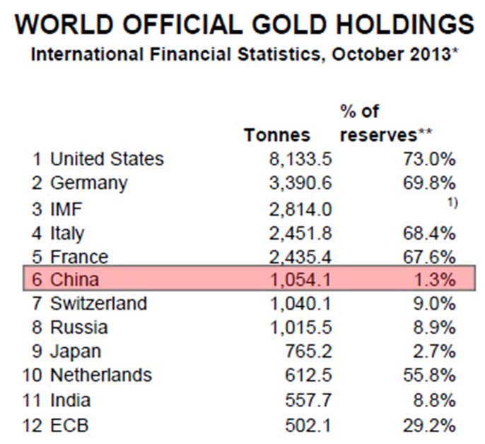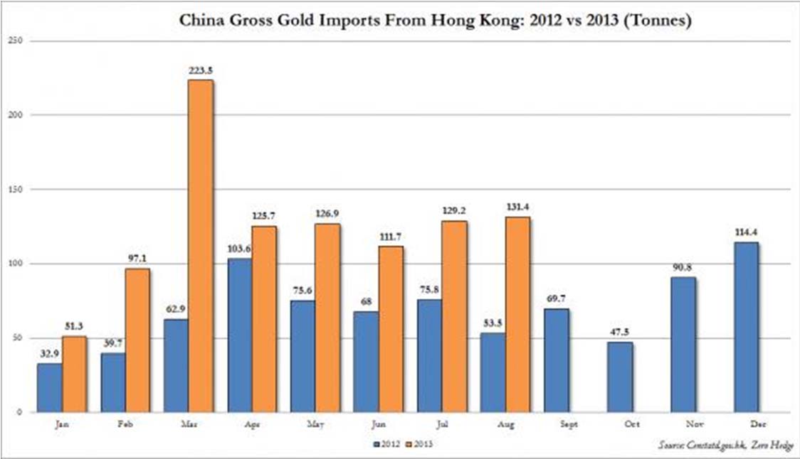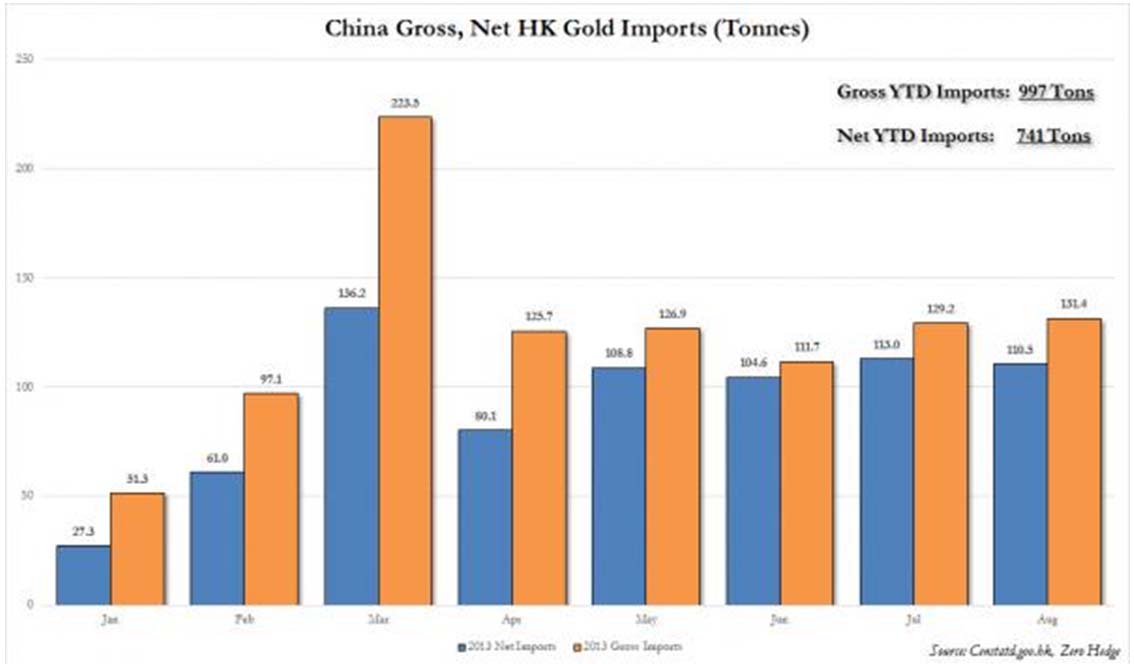 But what about exports of gold, and China’s net monthly gold needs. The chart below should answer that particular question. Net of gold export to Hong Kong, China imported 110.5 tons, the second highest net number in history, and second once again, only to March’s 136.2 tons. Year to date, China has imported a gross 997 tons, and a net 741 tons. Since this accounts for just two-thirds of the year in the history books, on a gross and net basis, China will likely import over 1500 gross and over 1000 net tons for all of 2013: an absolutely stunning record in gold demand by just one nation.