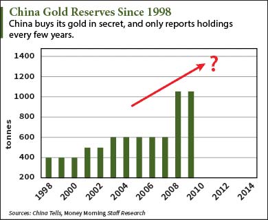 No one knows exactly how much gold China has – but we know it’s a lot. Last disclosed in April 2009, China gold reserves were at 1,054 tonnes. At least, that was the official number You see, China only reports its gold reserves every few years. The most recent number suggests the country upped its holdings 43%, adding 454 tonnes to the 600 tonnes the country claimed to have from 2003 to 2009.