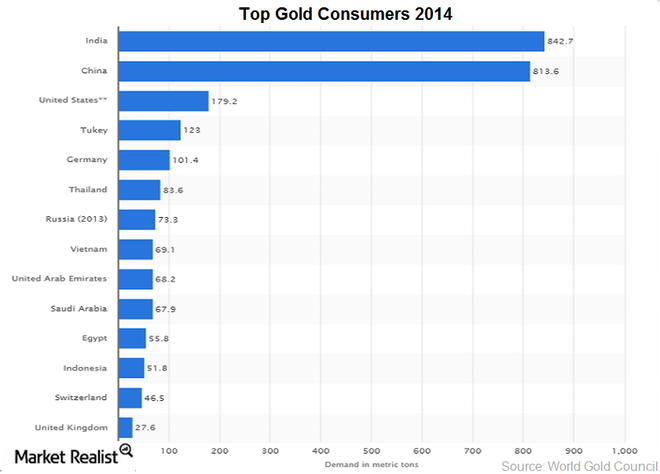 China and India’s gold buying activity increased the most in March 2015, according to data from the Swiss Federal Customs Administration. The data showed that China almost doubled its gold buying to 46.4 metric tons in March 2015. India also joined the party. It doubled its imports to almost 72.5 metric tons from the United Kingdom. This means gold moves from the United Kingdom. It’s refined in Switzerland and shipped to China and India.