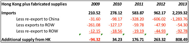 The bottom line, "Additional supply from HK" should be added to SGE deliveries and changes in SGE vaulted gold to create known demand for China and Hong Kong.