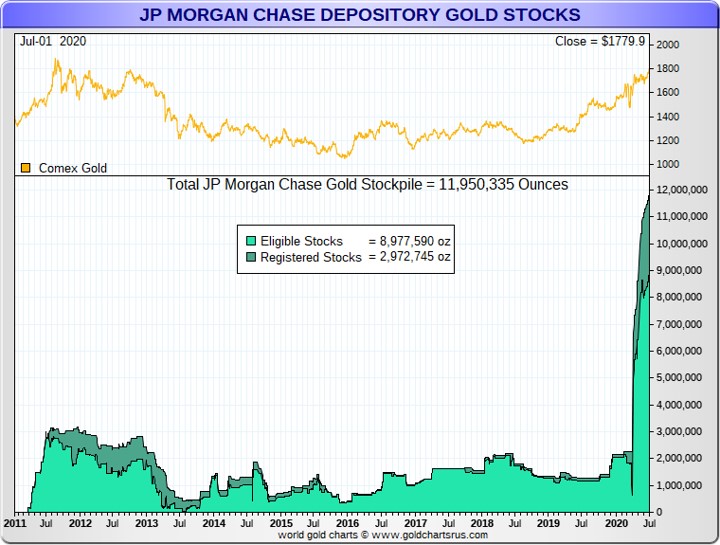 Reported gold holdings in COMEX approved vaults rocketed from 8.7 mn ozs to over 32 mn ozs between 24 March and 30 June. Source: