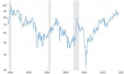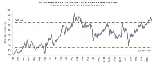 Incidentally, the 2019 gold-silver ratio of 86:1 ranks among the highest 2% of all time, dating back to 1687! There have been only two years since the US government removed the dollar from the gold peg - 1991 and 1992 - that there were higher ratios.