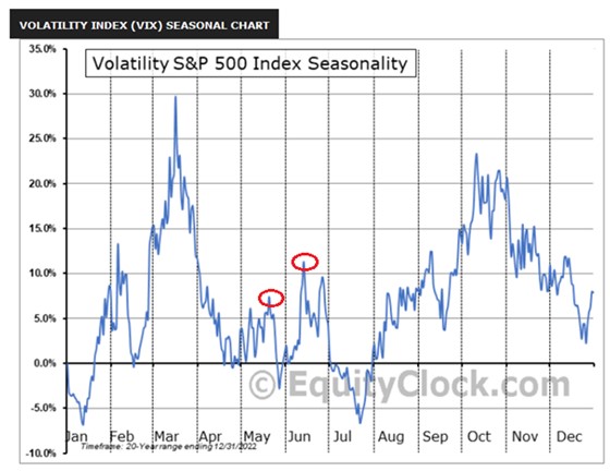 To explain, the blue line above shows how the VIX often bottoms near the end of April, then rises in May, falls again, then hits a new high in June. So, with the VIX’s clock turning bullish after next week, coupled with the rare weekly RSI reading, the data supports more uncertainty.