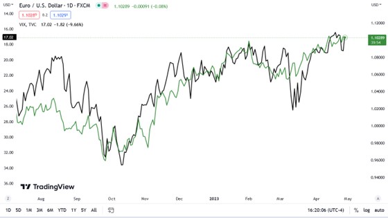 To explain, the green line above tracks the daily movement of the EUR/USD, while the black line above tracks the inverted (down means up) daily movement of the Cboe Volatility Index (VIX).