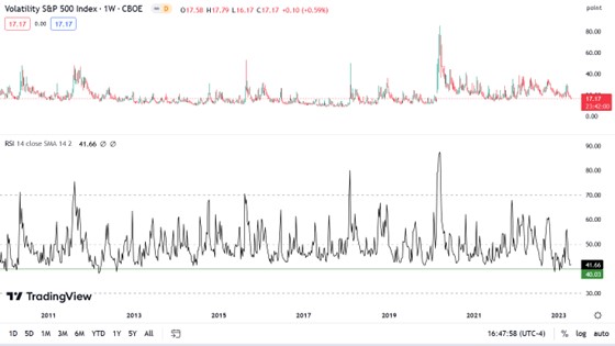 To explain, the candlesticks above track the weekly movement of the VIX, while the black line at the bottom tracks its weekly RSI. If you analyze the horizontal green line, you can see that weekly VIX RSI readings below 40 are rare over the last 10+ years.