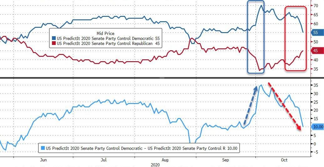 And BofA was worried, because since online odds still have a Biden victory as virtually assured, the reason for the slide in the chart above is the sudden surge in doubt that Democrats will wrest control of the Senate. Only without the Senate, the key anchor of the "stimulus" and "reflation" trades is gone.
