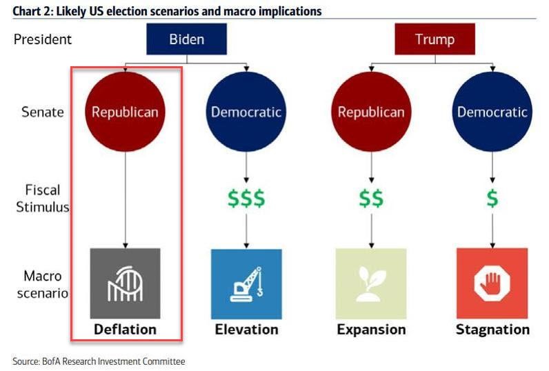 In fact, according to BofA the only scenario worse than a Trump presidency and a Democratic Congress (which results in Stagnation), is a Biden presidency and a GOP Senate, which would lead to Deflation. This is how the bank described this particular scenario: