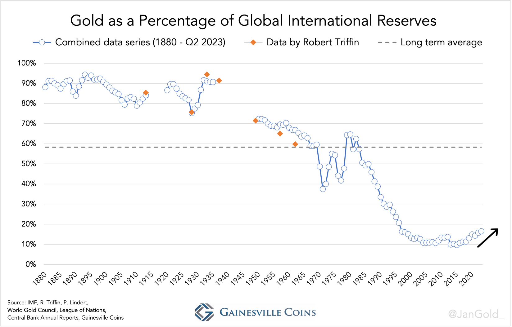 There is plenty of upside for the gold price if gold’s share of total reserves (currently 17%) should ever come close to its long-term average (58%). In a previous article I speculated gold could reach $8,000 in the next ten years.