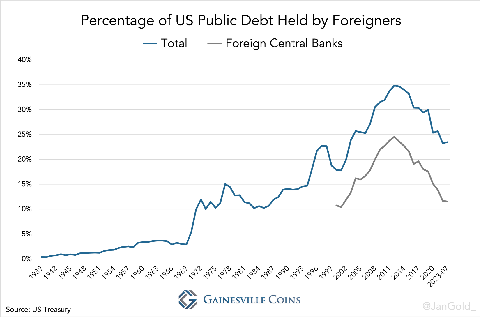 Foreign central banks mostly own US government bonds (Treasuries) as dollar assets. As their gold reserves are rising, their nominal holdings of Treasuries have been roughly flat in the past decade. So, against massive increases in US public debt every year, the share of foreign central banks owning that debt is steadily decreasing. This dynamic could lead to a funding crisis in the US, further eroding the dollar’s appeal as a reserve currency.