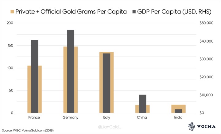 The amount of gold each citizen owns on average, directly and via their central bank, is roughly equal to their economic income. At a gold price of about $10,000 dollars per ounce, that is. The biggest difference is between China and India.
