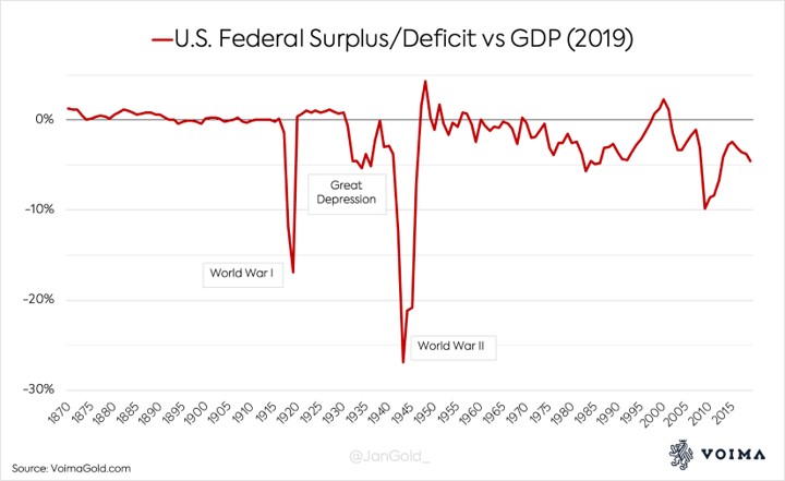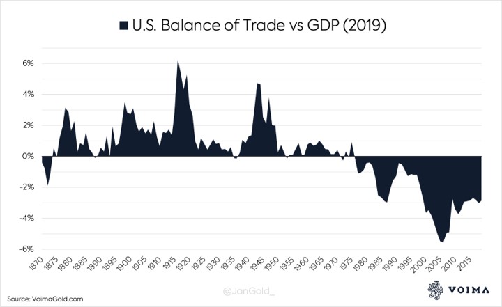 The U.S. never did “raid the gold market once and for all.” They sold roughly 500 tonnes in the late 1970s and 1980s in an attempt to lower the price in the free market. Gold traded more or less sideways throughout in the 1980s and 1990s, but didn’t get phased out of the international monetary system. However, the Americans succeeded in imposing the paper dollar standard on the world. There was a lot of discussion in the 1970s about the Special Drawing Right (SDR), a reserve asset issued by the International Monetary Fund, but it didn’t function (and still doesn’t). The U.S. could continue to print and export dollars, and Treasuries became the main international reserve asset. As a result, the U.S. has been running a trade and fiscal deficit since 1971.