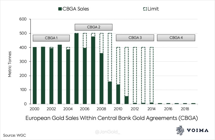 The World Gold Council interpreted CBGA as removing “concern that uncoordinated central bank gold sales were destabilising the market, driving the gold price sharply down.” It’s true that some European countries sold significant amounts of gold before CBGA, which drove the price down, and right after CBGA was announced the gold price started to rise. Mission accomplished, I would say.