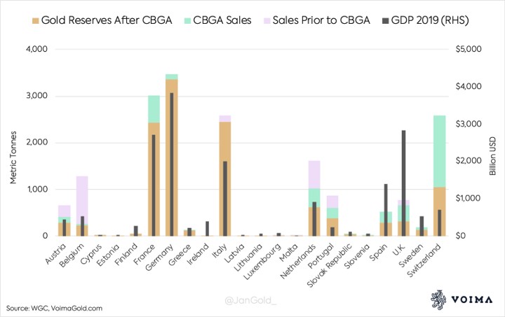 To get a sense of the equalization process within Europe, I have made a chart showing gold sales per country before and during CBGA, current gold reserves, and Gross Domestic Product (GDP).