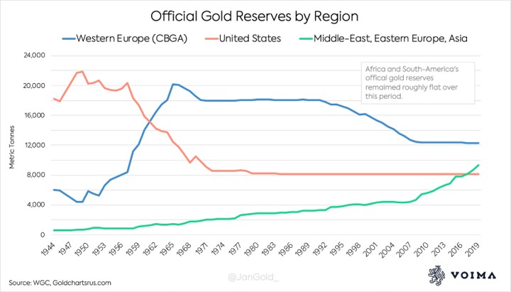 Official gold reserves around the world are spread more evenly since the 1970s. Eurasia minus Western Europe held 2,000 tonnes in 1971, versus 9,300 tonnes currently.