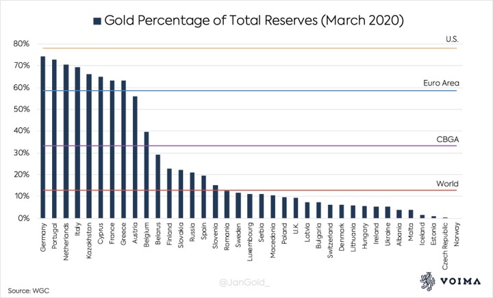 We undoubtedly read about preparing for a change in the international financial system, and balancing gold reserves proportionally. I’m aware de Jager, MNB, and NBP talk about leveling “gold reserves as a percentage of total reserves,” but I see a more significant pattern in gold reserves versus GDP. To be complete, below is a chart showing official gold reserves as a percentage of total reserves (foreign exchange, gold, and SDRs) for European countries.
