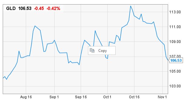 As investors can see, the SPDR Gold Shares ETF (NYSEARCA:GLD) has been down over 5% since the hawkish Fed statement as a result of the belief that Ms. Yellen and the Federal Reserve will raise interest rates when they conclude their next meeting in December.