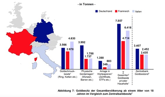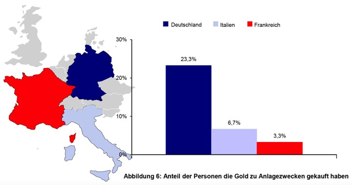 My starting point is a study (“Goldbesitz der Privatpersonen in Deutschland”) performed by the German Research Center for Financial Services in 2010. The study covered the motives for people to own gold and how much gold they own. Although the survey was mainly aimed at the German population, figures for Italy and France were also disclosed.