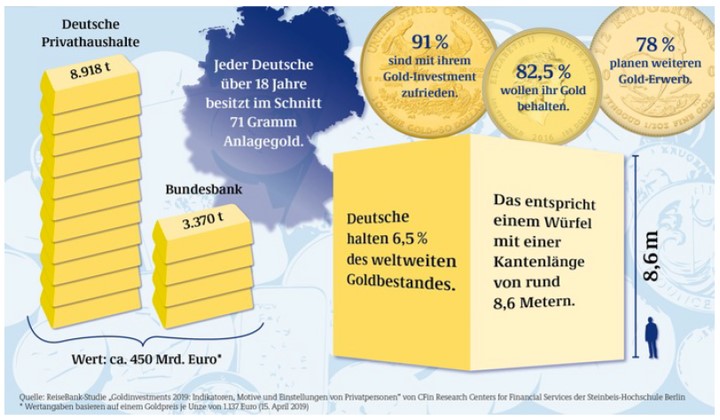 Courtesy ReiseBank (2019). “Deutsche privatehaushalte” means “German private households.” The “Bundesbank” is Germany’s central bank. The cube reads, “Germany owns 6.5% of all above-ground gold,” when the private gold is combined with Bundesbank’s.Early 2019 CFin estimated that the German people owned 8,918 tonnes of physical gold in bars, coins, and jewelry, while in 2010, this total accounted for 7,558 tonnes. In other words, the German private gold hoard increased by 1,360 tonnes in ten years.