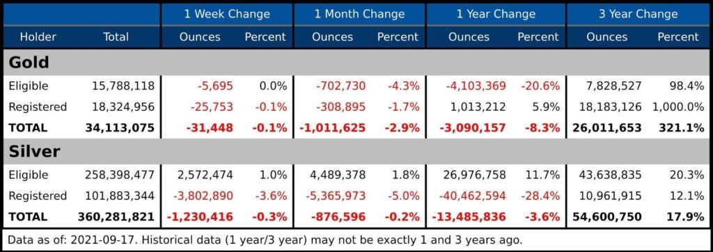 This analysis focuses on gold and silver within the Comex/CME futures exchange. See the article What is the Comex? for more detail. The charts and tables below specifically analyze the physical stock data at the Comex to show the physical movement of metal into and out of Comex vaults.