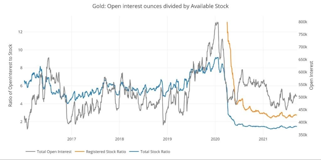 Coverage in silver is not nearly as strong with 6.9 open interest ounces to each available physical supply of registered. This was as low as 6.75 in July, so has been creeping up in recent weeks.