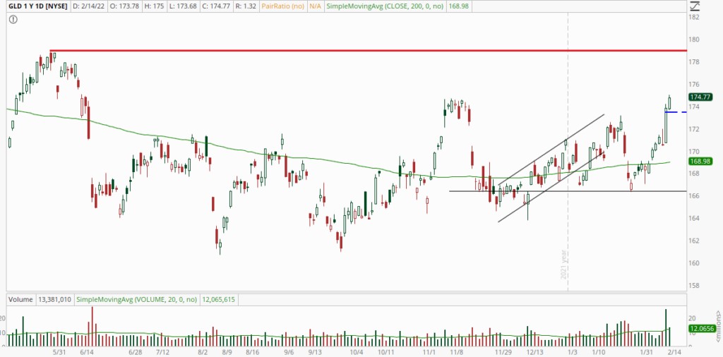 The SPDR Gold Trust (NYSEARCA: GLD) made it's highest close since June 14, 2021 today. It's 0.55% advance showed up the 0.38% decline in the S&P 500, but paled in comparison to the 2.04% advance in GDX. With today's move, it appears that GLD may be poised to test the June 2021 high near $179.
