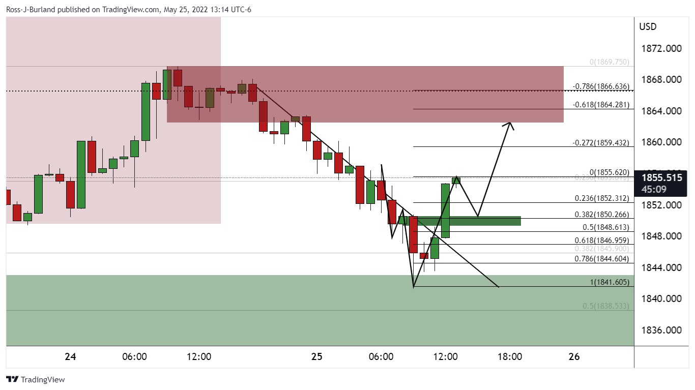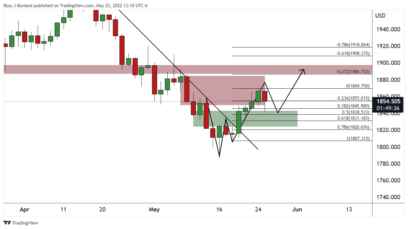 As per the hourly chart, the price is breaking out of the correction's dynamic resistance and a restest of the W-formation's neckline could result in the bulls claiming a discount for a move higher towards the prior highs near $1,865 for the sessions ahead.
