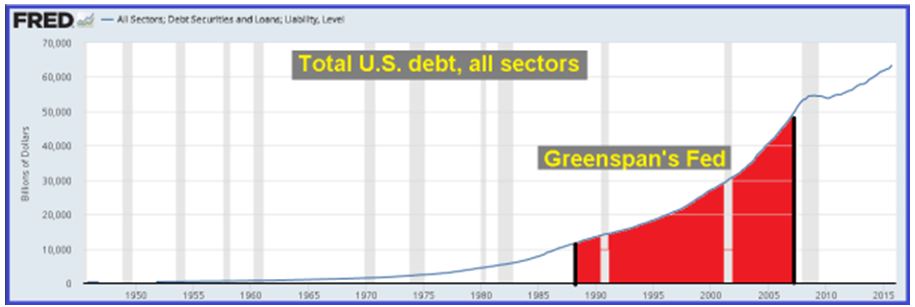 The graph above shows total debt outstanding system-wide in the U.S. during Greenspan’s Fed. The level debt increased 400%. GDP? Not so much. Real GDP is said to have grown about 85%, but this metric is overstated by the amount that the Government underestimates the true inflation rate and by gimmicked changes to the GDP calculation for purposes of political expediency.