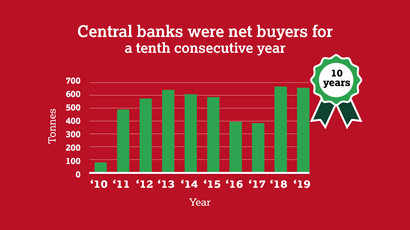 Central banks were net buyers for a 10th consecutive year: global reserves grew by 650.3t (-1% y-o-y), the second highest annual total for 50 years. Purchasing in Q4 of 109.6t was 34% lower y-o-y, although this was partly a reflection of the sheer scale of buying in 2018.