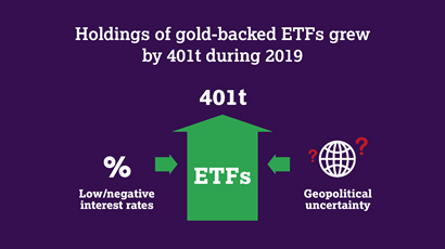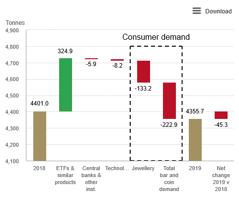 Gold demand fell 1% in 2019 as a huge rise in investment flows into ETFs and similar products was matched by the price-driven slump in consumer demand.