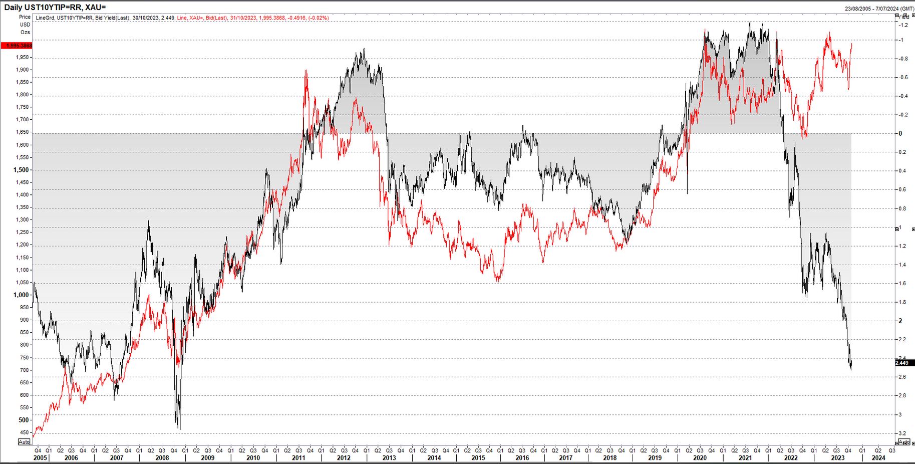 Normally, when real yields offer risk-free returns of this magnitude, gold would be getting hammered. For instance, when 10-year real yields were last trading at 2.45%, gold was trading near $750 per ounce, not the near $2000 level where it sits today. For now, the relationship looks to have broken down, potentially reflecting concerns about the US fiscal trajectory which has seen investors demand greater compensation for funding the US government, especially longer-term debt.