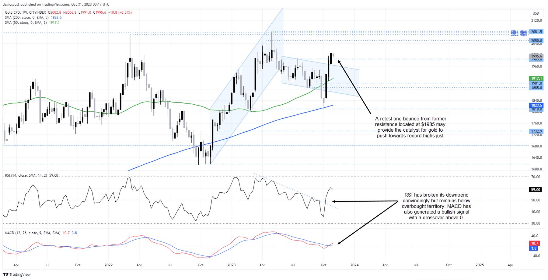 On the topside, $2050 would be the initial target before a potential retest of the 2023 record high just above $2080 should the former give way.