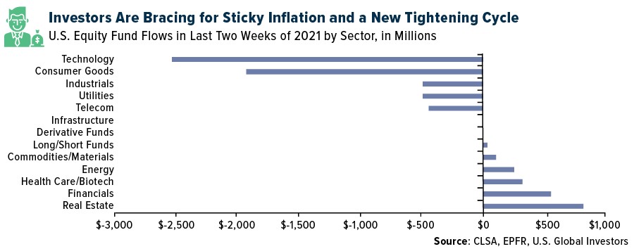 None of this should come as a surprise to most of you. Investors, in fact, have already begun teeing things up for a new tightening cycle as well as sticky inflation. 2021 was a record year for U.S.-listed ETFs, attracting over $900 billion in net flows, and the chart below, courtesy of CLSA, shows where investors were allocating capital in the final two weeks of the year. As expected, technology saw the heaviest outflows, as the sector tends to be highly capital-intensive and has among the most elevated valuations.