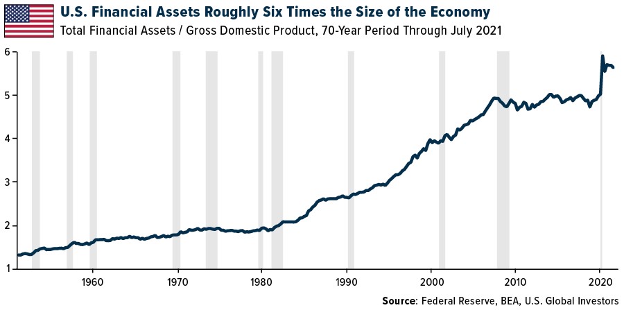I believe real estate’s key appeal right now is that it’s a real asset, the same as commodities, metals, gold and other materials, which also saw positive flows in the last two weeks of 2021. You may not know this, but the U.S. is shockingly financialized, with financial assets at roughly six times the size of the economy.