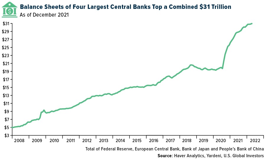 The size of the Fed’s balance sheet, as I said, has ballooned to an unheard-of $9 trillion, and if you include the assets of the central banks of the European Union (EU), China and Japan, you’re looking at a combined $31 trillion as of the end of 2021.