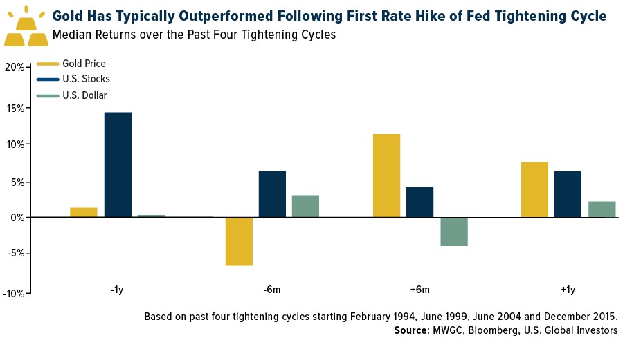 It’s a smart move. Gold has historically performed well in times of not only higher inflation but also rising rates, according to the World Gold Council (WGC). If we look at the past four Fed tightening cycles, between February 1994 and December 2015, the yellow metal underperformed in the months leading up to the Fed’s first rate hike but then outperformed U.S. stocks and the dollar six months and one year following liftoff.