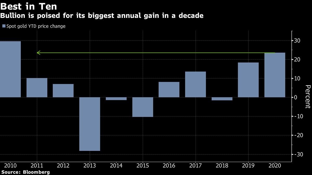 Gold is set for the biggest annual advance in a decade after a tumultuous year, with gains this month aided by the dollar’s decline to the lowest level since April 2018.