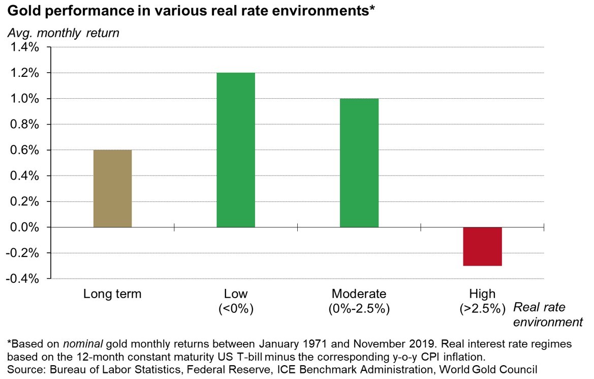 Gold has historically performed well in the year following Fed policy shifts from tightening to “on-hold” or “easing” – the environment in which we currently find ourselves. In addition, when real rates have been negative, gold has historically returned twice as much annually as the long-term average, or 15.3%. Even low positive real rates produce higher average returns. Effectively, it has only been in periods with significantly higher real interest rates – an unlikely outcome given the current market conditions – that gold returns have been negative.